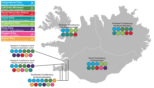 63 депутата Альтинга избираются по партийным спискам по пропорциональной системе в многомандатных избирательных округах, включающих от 8 до 13 мест парламента.[3] Из 63 депутатов 54 избираются на основе результатов по округам с подсчётом по методу Д’Ондта. Остальные 9 дополнительных мест передаются политическим партиям, преодолевшим 5%-й избирательный барьер, чтобы общее число мест партий соответствовало национальной доле отданных за них голосов.[3]