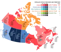 Либералы под руководством действующего премьер-министра Джастина Трюдо получили наибольшее число мест — 157, что позволило им сформировать правительство меньшинства. Консерваторы под руководством Эндрю Шира оставались официальной оппозицией и, получив 121 место, образовали самую крупную оппозиционную группу в истории Канады[29][30].