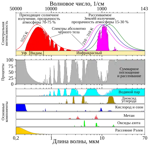 Основными парниковыми газами, влияющими на поглощение инфракрасного излучения Земли, являются водяной пар, углекислый газ, метан и озон[12].