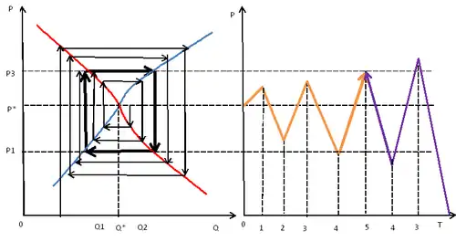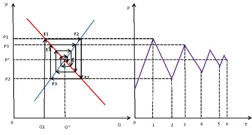 В случае изменения (падения) количества производства до уровня , что соответствует точки на кривой спроса, равной цене , что выше равновесной цены . Новая цена стимулирует производителей производить больше, равной точки на линии предложения, но покупатели готовы покупать только по цене , что соответствует точке на кривой спросе, а значит производители принимают решение сократить производство до уровня на кривой предложения, что позволяет поднять цены до уровня , что соответствует точке на кривой спроса и так далее до точки равновесия [10].