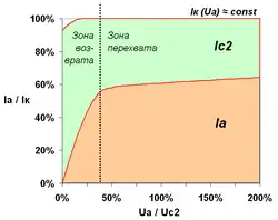 - Режим возврата. При снижении анодного напряжения до порога в 10…50 % часть электронов, ранее достигавших анода, оказывается не в состоянии преодолеть его тормозящее поле () которое отражает их назад на экранирующую сетку. На анодной ВАХ возникает участок с уменьшенным дифференциальным сопротивлением. При дальнейшем снижении ток анода резко падает, а ток экраной сетки так же резко растёт[59]. В предельном случае, когда снижается до нуля, весь ток катода передаётся на экранирующую сетку. Нелинейность и нестабильность параметров в режиме возврата недопустимо велики, поэтому рабочая точка пентода выбирается так, чтобы при всех возможных мгновенных значениях Ua лампа оставалась бы в режиме перехвата.