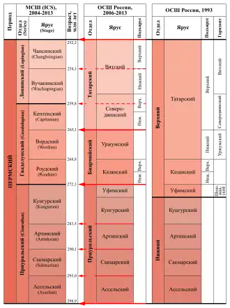 В соответствии с Общей стратиграфической шкалой (ОСШ), принятой на конференции в Казани в 2004 году, в пермской системе российские геологи выделили три отдела: нижний (приуральский), средний (биармийский) и верхний (татарский). В состав нижнего (приуральского) отдела вошли следующие ярусы (снизу вверх): ассельский, сакмарский, артинский, кунгурский, уфимский. В состав среднего (биармийского) отдела вошли казанский и уржумский ярусы, в состав верхнего (татарского) отдела — северодвинский и вятский ярусы. Также предлагалось выделить между уржумским и северодвинским ярусами отдельный юрпаловский ярус, и вязниковский ярус над вятским ярусом[15]. Отнесение уфимского яруса к нижней перми привело к отличию в объёме кунгурского яруса от Международной стратиграфической шкалы (МСШ, см. иллюстрацию)[11].