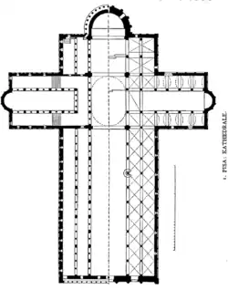 Здание изначально было построено в виде греческого креста (с равными перекладинами) в плане, в пересечении перекладин которого сооружён купол. В настоящее время пятинефный собор с трёхнефным трансептом в плане имеет вид латинского креста. Такой своеобразный план здания имеет сходство с планом древнехристианской базилики Калат-Симан, расположенной в Сирии[2]. Внутри возникает эффект огромного пространства, аналогичный большим мечетям и достигаемый за счёт арок и чередования белого и чёрного мрамора. Две колоннады из чёрного гранита в нефах являются явным свидетельством византийского влияния. Сами колонны происходят из мечети Палермо, завоёванной пизанцами в 1063 году.