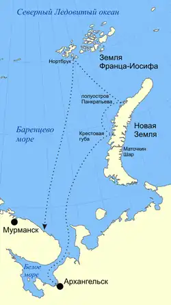 К середине июля команда была готова к возвращению: были сняты и распилены на топливо стеньги и фальшборт. Результаты научных работ были запаяны в цинковые ящики на случай, если придётся бросить судно и идти на баркасе[48]. После гибели Седова командование взял на себя второй помощник Николай Сахаров, а В. Визе и Н. Пинегин стали его заместителями. В середине июля команду отрядили пилить лёд, а разразившийся 25-го числа шторм взломал паковые поля. Якорь подняли 30 июля в десять часов утра. Было решено плыть северным путём, однако почти сразу у острова Скотт-Келти судно село на мель. Чтобы максимально разгрузиться, слили 35 тонн пресной воды и выбросили двухтонный якорь с цепью. Вскоре ледовое поле стащило корабль на воду. В окрестностях мыса Флора Пинегин работал за штурмана, поскольку знал эти места. За это время было добыто три моржа и два тюленя, жир которых дополнял древесину в топке парового котла[49][50]. У мыса Флора 2 августа команда заметила людей, приближающихся на каяке к борту судна. Это был штурман экспедиции Брусилова В. Альбанов, который вместе с матросом Конрадом оставил свою экспедицию и двигался на Нортбрук. Остальные участники его санной партии погибли или бесследно пропали[51].
