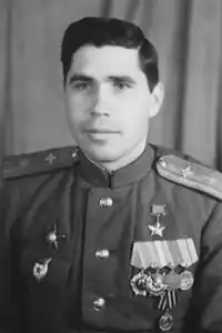 - ↑ На момент присвоения звания Героя Советского Союза — старший лейтенант.