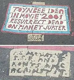 - ↑ L. A. Johnson: Mysteries underfoot: Pedestrians have long wondered over Toynbee tiles Архивная копия от 12 октября 2013 на Wayback Machine. Post-gazette.com, 31 мая 2006 (en)