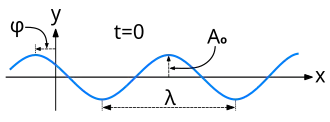 На этом анимированном изображении по горизонтальной оси отложена координата в пространстве, по вертикальной — значение колеблющейся некоторой физической величины , образующей волну с гармонической зависимости от времени, в каждой точке пространства в текущий момент времени. Синяя линия — график пространственной зависимости физической величины в текущий момент времени Зависимость от координаты также гармоническая. Смещаясь с течением времени вправо, график совпадает с самим собой в предыдущий момент времени, — волновой процесс. Синий кружок изображает колебание физической величины в одной из точек по координате Анимация движения плоской волны