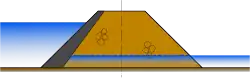 Грунтовые, или земляная плотина строится из грунтовых материалов, в том числе песчаных, суглинистых, глинистых, как правило, без перелива воды через неё. Обычно форма поперечного сечения приближается к трапецеидальной[13]. Грунтовые плотины просты по конструкции, строительство их возможно в очень широком диапазоне геологических условий. Учитывая это, а также использование при возведение плотины местных строительных материалов, почти полную механизацию труда и сокращение трудозатрат, грунтовые плотины можно считать самым распространённым типом водоподпорного сооружения. Грунтовые плотины относятся к гравитационным плотинам.