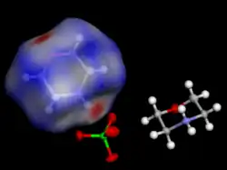 Некоторые примеры применения поверхности Хиршфельда [4][5]. Для сравнительно простых молекул поверхность Хиршфельда может быть сгенерирована прямо на сайте журнала Acta Crystallographica Sec.E — Crystallographic Communications, например для катиона морфолиния, пройдя на страницу оригинальной статьи[6] , при нажатии на панели слева кнопки 3D-view, попадаешь на страницу, где имеется опция «сгенерировать поверхность Хиршфельда» и, после выделения желаемого фрагмента, получается следующее изображение: