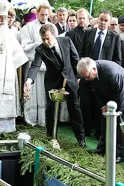 Далее священник бросает землю на покойника до закрытия крышки гроба. Закрытый гроб опускают в могилу, священнослужитель поливает гроб елеем, посыпает его пеплом и зёрнами пшеницы, и землёй. Затем каждый, кто провожает умершего в последний путь, бросает в могилу свою горсть земли. Над могильным холмиком устанавливается крест[5], как символ Спасения. Крест ставится восьмиконечный, из любого материала, но обязательно правильной формы. Он устанавливается у ног покойного, Распятием к лицу усопшего, чтобы при воскресении из мёртвых, восстав из земли, христианин смог взирать на предвестие победы Христа над смертью, над дьяволом. Можно также установить любой памятник, главное, чтобы на нём было изображение православного креста. На могильный холм устанавливают венки, в центре — кладут цветы. Теперь все желают покойному Царствия Небесного и уходят поминать усопшего. Могилы христиан должны содержаться в чистоте и порядке, быть благоустроенными и ухоженными.