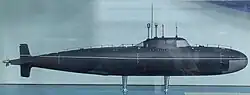 - Проект 686 — согласно постановлению 1964 года, предполагалось создание новой атомной подводной лодки по проекту 686, вооружённой 16 противокорабельными крылатыми ракетами П-120 «Малахит»[8]. Эскизный проект как развитие проекта 705 был подготовлен в СКБ-143 под руководством А. К. Назарова. Лодка должна была нести 16 ракет, достигать скорости подводного хода более 30 узлов и обладать рабочей глубиной погружения до 400 метров. В 1965 году эскизный проект был готов, однако сложности в освоении подводных лодок базового проекта 705, а также появление новых тактико-технических требований привели к закрытию проекта 686.