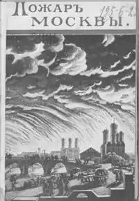 Самый крупный московский пожар столетия начался в ночь со 2 (14) на 3 (15) сентября 1812 года, после вступления в город войск Наполеона. Сильное возгорание длилось около недели и окончательно утихло лишь к 6 (18) сентября. По свидетельствам очевидцев, «в покинутой жителями Москве очаги пламени, раздуваемые ураганным ветром, слились в один огромный костер». По распространённой версии, приказ поджигать покинутый город отдал московский генерал-губернатор, граф Фёдор Ростопчин[235]. Однако большой урон городу нанесли оккупанты, на Тверской сохранилось лишь 12 домов, а в Китай-городе — два, в пожаре погибли Императорский университет с библиотекой и архивами. Были утрачены многие памятники культуры: считается, что в то время сгорел единственный экземпляр «Слова о полку Игореве» из коллекции Алексея Мусина-Пушкина[236]. При отходе французские войска заминировали Грановитую палату, Арсенал, колокольню Ивана Великого, башни и стены Кремля. Несколько башен с пряслами, часть Арсенала и две пристройки к колокольне были взорваны. Среди уцелевших исторических зданий — Английский двор XV века в Зарядье, самое старое «многоэтажное здание» древней столицы — сушило Симонова монастыря, а также дом Фёдора Растопчина[237]. В результате отступления, по подсчётам историков, сгорело две трети построек: из 2567 каменных домов сгорело около двухсот, а из 6591 деревянных уцелело порядка 250. Кроме того, в огне пострадали 122 храма, 8251 складское и торговое помещение. Общий ущерб от городских разрушений был оценён в 320 миллионов рублей[238][239]. По масштабам реконструкции этот проект сравнивают с возведением Петербурга в XVIII веке[208].