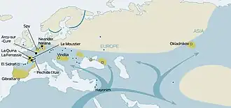 Этот переход от среднего к позднему палеолиту называют революцией позднего палеолита[8][9]. Неандертальцы, в отличие от кроманьонцев, продолжали пользоваться древней мустьерской технологией изготовления каменных инструментов до своего полного исчезновения около 39 тысяч лет до нашей эры. Заселившие Европу кроманьонцы впервые начали строить более или менее постоянные поселения, нередко с ямами для хранения продуктов. Они часто располагались в узких горных долинах или среди обрывистых берегов рек, что, вероятно, облегчало охоту на проходящих вдоль берегов рек животных. Как правило, в местах поселений люди появлялись лишь в определённый сезон, когда происходили миграции животных, и уходили искать другие источники пищи, когда миграции заканчивались. Реже в селениях жили круглый год. Важнейшим для европейцев того времени пищевым ресурсом был северный олень[10]. Homo sapiens начала позднего палеолита, такие как усть-ишимский человек, были охотниками на травоядных животных. В их рационе преобладало мясо, тогда как у людей конца позднего палеолита — начала мезолита доля мяса в рационе была даже ниже, чем у неандертальцев[11].
