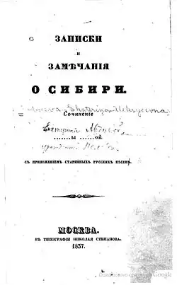 Обложка книги «Записки и замечания о Сибири. С приложением старинных русских песен»