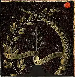 На обороте, как это изредка бывало в портретном жанре того периода, изображена эмблема: вертикальная ветвь можжевельника в обрамлении венка из лавровой (символ поэтического занятия) и пальмовой (символ нравственности и христианского сострадания) ветвей. Ветви перевиты лентой (так называемой cartiglio) с латинским motto (изречением): «Virtutem forma decorat» («Красота — украшение добродетели; она украшает свою добродетель красотой»). Лавр и пальмовая ветвь символизируют идею триумфа добродетели, изобразительно продолжая начальные слова латинского гекзаметра, приведённого в изречении. Фон оборотной стороны визуально имитирует плиту из порфира (камня, который ценили за его вечность, твёрдость и редкостность, он являлся символом редкого и неизменного совершенства). Изучение картины и её расчистка в 1990 году показали, что венок и лента на обороте, возможно, были добавлены позднее, хотя окончательно это предположение не доказано.
