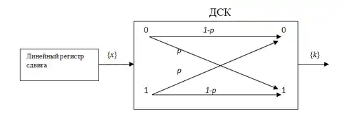 Для выявления влияния j-го линейного регистра сдвига (с выходной последовательностью {x(j)} на гамму шифра {g} моделируется часть генератора как двоичный симметричный канал (ДСК). Алгоритм атаки состоит из двух этапов (иногда называемые фазами):