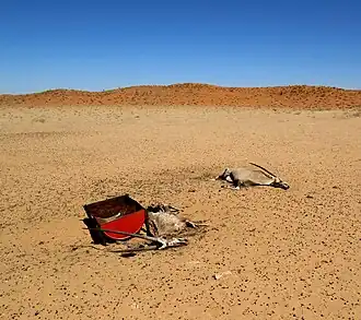 Человеческая деятельность может напрямую вызвать усугубляющие факторы для возникновения засухи, такие как чрезмерное земледелие, чрезмерное орошение[16], вырубка лесов и эрозия, что отрицательно сказывается на способности земли удерживать воду. В засушливом климате основным источником эрозии является ветер. Эрозия часто является результатом перемещения материала ветром. Взвешенные частицы воздействуют на твёрдые объекты, вызывая эрозию за счет абразии. Ветровая эрозия обычно происходит в районах с небольшой растительностью или без неё, часто в районах, где осадков недостаточно для поддержания растительности[17].