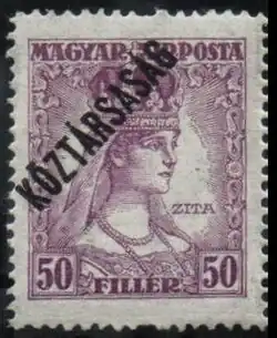 | 1918: почтовая марка Венгерского королевства (портрет королевы Зиты) с надпечаткой слова «Köztarsasag» («Республика») (Mi #115) |