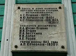 Здесь, в доме бывшей почтово-ямщицкой станции, останавливались: А. С. Пушкин (1829), М. Ю. Лермонтов (1840), А. С. Грибоедов (1818, 1823, 1828); ссыльные декабристы – В. А. Мусин-Пушкин, И. И. Пущин, П. А. Бестужев, Н. И. Лорер, А. Е. Розен, герой войны 1812 года А. П. Ермолов (1820).