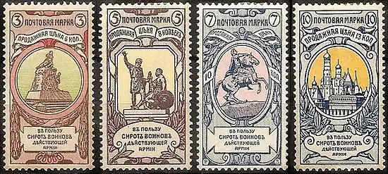 Второй выпуск почтово-благотворительных марок Российской империи состоялся в начале Первой мировой войны в ноябре 1914 года также по ходатайству Императорского женского патриотического общества. Часть дохода от этих марок отчислялась в фонд помощи раненым и семьям погибших воинов[2].
