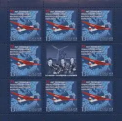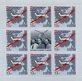 - ↑ 75 лет рекордному трансполярному перелету. rusmarka.ru. Дата обращения: 4 сентября 2023. Архивировано 5 сентября 2023 года.
