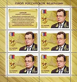 - ↑ Герои Российской Федерации. Продолжение серии. Карлов Андрей Геннадьевич (1954–2016). rusmarka.ru. Дата обращения: 15 октября 2023. Архивировано 30 сентября 2022 года.