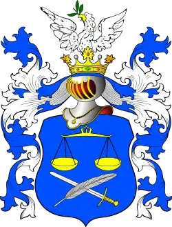 Щит увенчан дворянскими шлемом и короной. Нашлемник: половина белого орла с оливковой ветвью о трёх листках в клюве. Намёт на щите голубой, подложенный серебром.