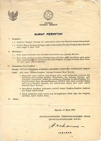 В ночь с 30 сентября на 1 октября 1965 года группа военнослужащих Национальной армии Индонезии, называющих себя «Движением 30 сентября», захватили и убили шесть армейских генералов, как считается, принадлежавших к антиреволюционному «Совету генералов», включая командующего армией Ахмада Яни, в то время как другая цель восставших — Абдул Харис Насутион — сумел сбежать[8][9]. Тела всех убитых были вывезены в предместье Джакарты — Лубанг Буайя, и сброшены в колодец[10]. Тем же утром подразделения вооружённых сил заняли площадь «Медан Мердека» в центре Джакарты. В штаб-квартире Радио Республики Индонезия (индон. Radio Republik Indonesia) подполковник президентской охраны «Чакрабирава» Унтунг Шамсури объявил о том, что при попытке предотвратить переворот «Совета генералов», «Движение» заняло несколько ключевых мест столицы страны. Он также заявил, что президент Сукарно находится под их властью[11]. Ядро руководства Движения расположилось на военной авиабазе Халим Перданакусума[12].