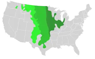 - Высокотравные, или настоящие, прерии занимают более влажную восточную часть региона, граничащую с зоной листопадных лесов. Характеризуются богатыми почвами, основная растительность — дерновинные степные злаки с длинными корнями (бородачевники, Spartina patens) во влажных низинах и кустовые злаки с более короткими корнями (Hesperostipa spartea, Sporobolus heterolepis) в более сухих возвышенных районах[5].