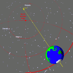Явление векового — медленного — движения северного и южного полюсов мира по небесной сфере называется прецессией. Она возникает в связи с тем, что Земля имеет форму геоида — сплюснута у полюсов и ось её суточного вращения не перпендикулярна к плоскости эклиптики. Сплюснутость Земли можно рассматривать как существование «пояса дополнительной массы» на её экваторе. Гравитационные поля Солнца и Луны, находящихся в плоскости эклиптики, воздействуют на этот пояс, как бы стремясь повернуть земную ось вращения и привести её в перпендикулярное эклиптике положение. Это и заставляет земную ось описывать конус с углом около 23,5 ° при вершине, совпадающей с центром Земли, за промежуток времени 26 тыс. лет. Через 4000 лет северный полюс мира окажется в созвездии Цефея, а через 14000 лет — около звезды Вега из созвездия Лира. Даже за сто лет положение Полярной звезды относительно северного полюса мира заметно изменилось. Полюс стал ближе к Полярной звезде на тридцать угловых минут.