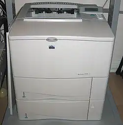 Принтер (англ. printer) — устройство, автоматически печатающее информацию представленную в компьютере в буквенно-цифровой или графической форме.[1] Исторически существовало разделение на символьные печатающие устройства и графопостроители, которые вычерчивали изображения. В 80-е годы обе группы устройств стали часто перекрывать возможности друг друга.[2]:66 В настоящее время выделяют вид устройств для нанесения преимущественно изображений (плоттеры), но отличаются они не техникой нанесения, а форматом передаваемых данных.[3] Слово принтер вошло в русский язык в 80-е годы[4] (первоначально — для печатающих устройств, подключаемых непосредственно к персональным компьютерам[5]). Печатающие устройства можно разделить на группы по возможности работы с персональными компьютерами. Существуют группы печатающих устройств не работающих с персональными компьютерами или работающих как с ними, так и с иным оборудованием.[6]:5