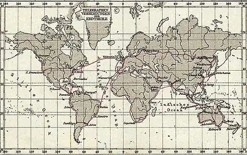 В 1858 году была установлена трансатлантическая телеграфная связь. Затем был проложен кабель в Африку, что позволило в 1870 году установить прямую телеграфную связь Лондон — Бомбей (через релейную станцию в Египте и на Мальте).