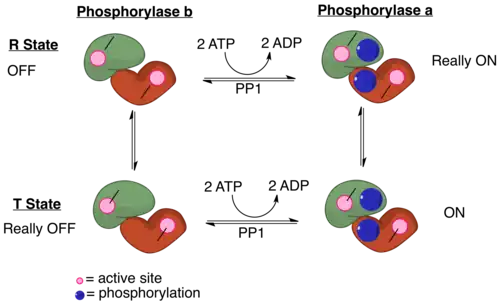 Когда мышцы тела сигнализируют о необходимости деградации гликогена и повышения концентрации глюкозы, PP1 будет регулироваться соответствующим образом. Протеинкиназа А может снижать активность PP1. Участок связывания гликогена, GM, фосфорилируется, что вызывает его диссоциацию от каталитического звена PP1.[11] Это разделение каталитической единицы PP1, гликогена и других субстратов вызывает значительное снижение дефосфорилирования. Кроме того, когда другие субстраты фосфорилируются протеинкиназой A, они могут связываться с каталитической субъединицей PP1 и напрямую ингибировать её.[11] В итоге фосфорилаза сохраняется в активной форме, а гликогенсинтаза — в неактивной.