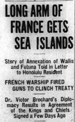 19 мая 1910 года с Францией был подписан новый договор о протекторате. Текст, действовавший до 1961 года, ограничивает полномочия короля Уоллиса, поставленного в подчинение резиденту, и полномочия миссионеров. Этот новый договор 1910 года должен был подготовить к аннексии, официально запрошенной королем в 1913 году, под влиянием резидента Виктора Брохара, 22 июня 1913 года крейсер Kersaint причалил к Уоллису и провёл церемонию, где французский флаг поднят перед королевским дворцом. Это, несомненно, беспокоит англоязычные соседние страны. Аннексия становится во Франции законопроектом в 1917 году, за который проголосовала Палата депутатов в 1920 году, но в 1924 году она была окончательно отклонена сенатом.