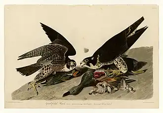 В конце октября 1826 года друзья в Эдинбурге познакомили Одюбона с гравёром Вильямом Лизарсом. Лизарс унаследовал от отца печатный бизнес и к моменту встречи уже участвовал в создании двух книг по орнитологии: Illustrations of British Ornithology (1821—1834) Прайдокса Джона Селби и Illustrations of Ornithology (1825—1843) Селби и Уильяма Джардина[78][79]. Несколько дней он рассматривал работы Одюбона, акцентируя внимание на крупных птицах, и, увидев портрет сапсана (Falco peregrinus), принял решение о публикации[78].