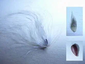Пуховка шаровидная или широкояйцевидная, диаметром до 3—4 см[6]. Плоды — продолговатые, трёхгранные[5] буровато-жёлтые или бурые орешки обратнояйцевидной (иногда — почти сердцевидной) формы, длиной от 2,3 до 2,5 (иногда до 3 мм), шириной от 1,3 до 1,5 мм[8][7].