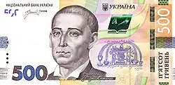 На аверсной стороне банкноты размещён портрет выдающегося украинского философа и учёного Григория Сковороды на фоне выполненного рукой Сковороды графического изображения фонтана с надписями «Не ра́вное всѣмъ ра́венство» (над фонтаном) и «Льются изъ разныхъ тру́бокъ, разные токи: въ ра́зные» (под фонтаном); изображение взято из раздела «Приметы некиих сродностей», входящего в диалог Сковороды «Разговор, называемый алфавит, или букварь мира»[2]. Кроме того, лицевая сторона банкноты содержит изображение Малого Государственного Герба Украины (трезубца), надписи «Україна» и «Національний банк України», номинал банкноты, указанный числом и прописью («П’ЯТСОТ ГРИВЕНЬ»), подпись председателя НБУ (с наименованием должности: «ГОЛОВА»), метка для людей с ослабленным зрением в виде трёх точек, изображение скрипки, надпись «Григорій СКОВОРОДА 1722—1794».
