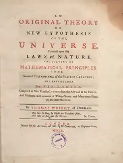 Наиболее известной работой Райта является An original theory or new hypothesis of the Universe (1750), в которой он объясняет появление Млечного Пути как «оптический эффект, связанный с нашим погружением в то, что в местном масштабе приближается к плоскому слою звёзд». Райт представил две модели: диска, состоящего из звёзд, обращающихся вокруг «божественного центра», и сферической оболочки из звёзд. Солнечная система находилась внутри этого диска или оболочки, что объясняло наблюдаемую форму Млечного Пути[3].