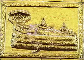 Вишну представлен в образе, известном в иконографии индуизма как Шешашаяна (Sesasayana) или Ананташаяна (Anantasayana). Это Вишну, лежащий на кольцах гигантского космического змея Ананта-шеши. Тысячеглавый змей символизирует бесконечность времени (вечность), в котором пребывает Вишну. Головы со змеиными капюшонами образуют защитный навес над Вишну. Сам змей Ананта-шеша вместе с Вишну пребывает в космических водах Молочного океана, символизирующего однообразное единство природы до создания Вселенной. Вишну покоится на змеином ложе в течение так называемой «ночи Брахмы», продолжающийся 4,32 миллиарда лет. Во время «ночи Брахмы» прошлая Вселенная разрушилась и боги погибли, а новая Вселенная из Вишну ещё не родилась. Все три гуны в Молочном океане пребывают в гармонии. Образ Вишну, возлежащего на космическом змее, корнями уходит в мифологию Пуран. Он отражает непроявленный аспект бога-создателя, который занимает главное место во многих вайшнавских храмах. Вишну, покоящийся на Шеше, отражает космическую природу бога и сравним с лингамом Шивы, который также связан с космической творческой силой бога в её потенциальной форме. Кроме того, Вишну, пребывающий в космических водах, символизирует сакральный звук и изначальную мантру «Ом»[4].