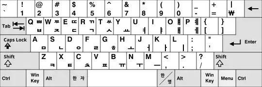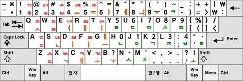 Существует несколько стандартов раскладки для корейского языка (хангылем). Самая распространённая раскладка называется Тубольсик (두벌식, 2벌식). В ней согласные расположены в левой стороне клавиатуры, гласные — в правой. Напряжённые согласные набираются с использованием клавиши Shift (например, на месте буквы w стоит корейская буква чхиыт (ㅈ), а при нажатии с Shift — ссанджиыт, ㅉ). Придыхательные согласные находятся в нижнем ряду клавиатуры.