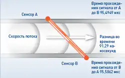 Принцип действия ультразвуковых расходомеров основан на измерении разницы во времени прохождения сигнала. При этом два ультразвуковых сенсора, расположенные по диагонали напротив друг друга, функционируют попеременно как излучатель и приёмник. Таким образом, акустический сигнал, поочерёдно генерируемый обоими сенсорами, ускоряется, когда направлен по потоку, и замедляется, когда направлен против потока. Разница во времени, возникающая вследствие прохождения сигнала по измерительному каналу в обоих направлениях, прямо пропорциональна средней скорости потока, на основании которой можно затем рассчитать объёмный расход. А использование нескольких акустических каналов позволяет компенсировать искажения профиля потока.