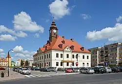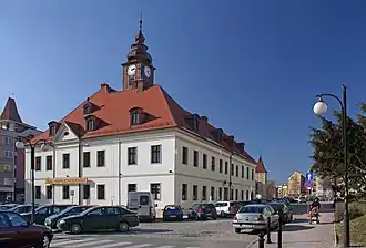 Ратуша представляет собой здание в стиле позднего барокко, построенное по прямоугольному плану, с двумя этажами и мансардной шатровой крышей с люкарнами.[1] Конёк крыши увенчан башенкой из медных листов с часами и барочным шлемом со шпилем.[1] Фасады украшены пологими ризалитами, увенчанными треугольными фронтонами.[1] Ризалит на западном фасаде имеет тимпан с гербом города, изображённым среди растительных орнаментов.[1]