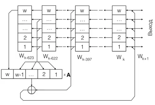 Рассмотрим наиболее распространённый вариант этого алгоритма — MT19937. Он использует 624 ячейки памяти, в каждой из которых содержится целое 32 битное число. При этом рекуррентное правило формирования последовательности выходных слов записывается таким образом: