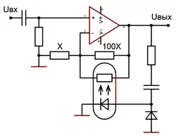 В СССР малогабаритные РО использовались в компрессорах звукового сигнала в дальней телефонной связи. Лампа накаливания РО подключалась к выходу операционного усилителя (ОУ), фоторезистор включался в делитель напряжения обратной связи неинвертирующего усилителя на ОУ. В зависимости от выходного напряжения, коэффициент усиления схемы изменялся от 1:1 до 1:10[79].