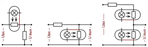 В простейших схемах регулятора уровня сигнала фоторезистор оптопары включается в верхнее (последовательное включение) или в нижнее (шунтирующее включение) плечо делителя напряжения[71].