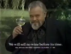 С 1978 по 1981 год Орсон Уэллс снимался в серии рекламных роликов винодельческой фирмы Paul Masson. Вино фирмы известно слоганом «We will sell no wine before its time» («Мы не продаем вино, пока оно не созреет»), который неоднократно пародировался в западной культуре конца XX века[1]. Спустя годы рекламные ролики снова приобрели известность, когда стали широко известны неудачные дубли работы над рекламными роликами, на которых был явно нетрезвый Уэллс на съемках одного из роликов[2].