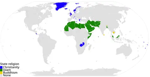 • Государственно-правовой подход выделяет религии, которые поддерживаются государством и не поддерживаются государством, а также религии, к которым государство относится нейтрально. Существуют религии, имеющие статус государственных, и религии, статус которых не закреплён государственными документами[39].