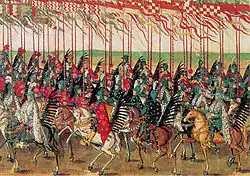 К середине XVI века в войнах с крымскими татарами и Русским государством окончательно сложилось характерное для польско-литовского войска XVI — 1-й половины XVII веков тактическое построение, известное как «старое польское уряженье». Ливонская война привела к реформе войска Речи Посполитой. В 1563 году «оброна поточная» была преобразована в «кварцяное войско» (wojsko kwarciane). В 1576 году гусария была выделена в отдельный род тяжёлой конницы, которая предназначались для нанесения таранного удара пиками в сомкнутых боевых порядках. Кавалерия была наиболее многочисленной и боеспособной частью польско-литовского войска, в которой гусария составляла бо́льшую часть[34].