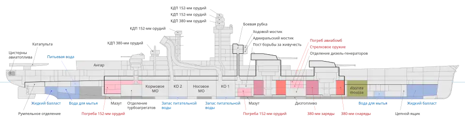 - бронирование: пояс 360 мм, верхняя палуба 160 мм, нижняя 40 мм, противоторпедная защита как на «Дюнкерке»[5].