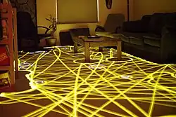 - Виртуальная стена или ограничитель движения — обычно это специальный излучатель, который с помощью инфракрасного луча создает невидимую зону различной формы, в которую пылесос не должен заезжать. Иногда вместо инфракрасного луча используется магнитная лента приклеиваемая на пол. Используется для ограничения района уборки роботом-пылесосом; Зачастую в комплект уже входит 1 стена, но количество используемых стен, с которыми может работать робот обычно не ограничено.